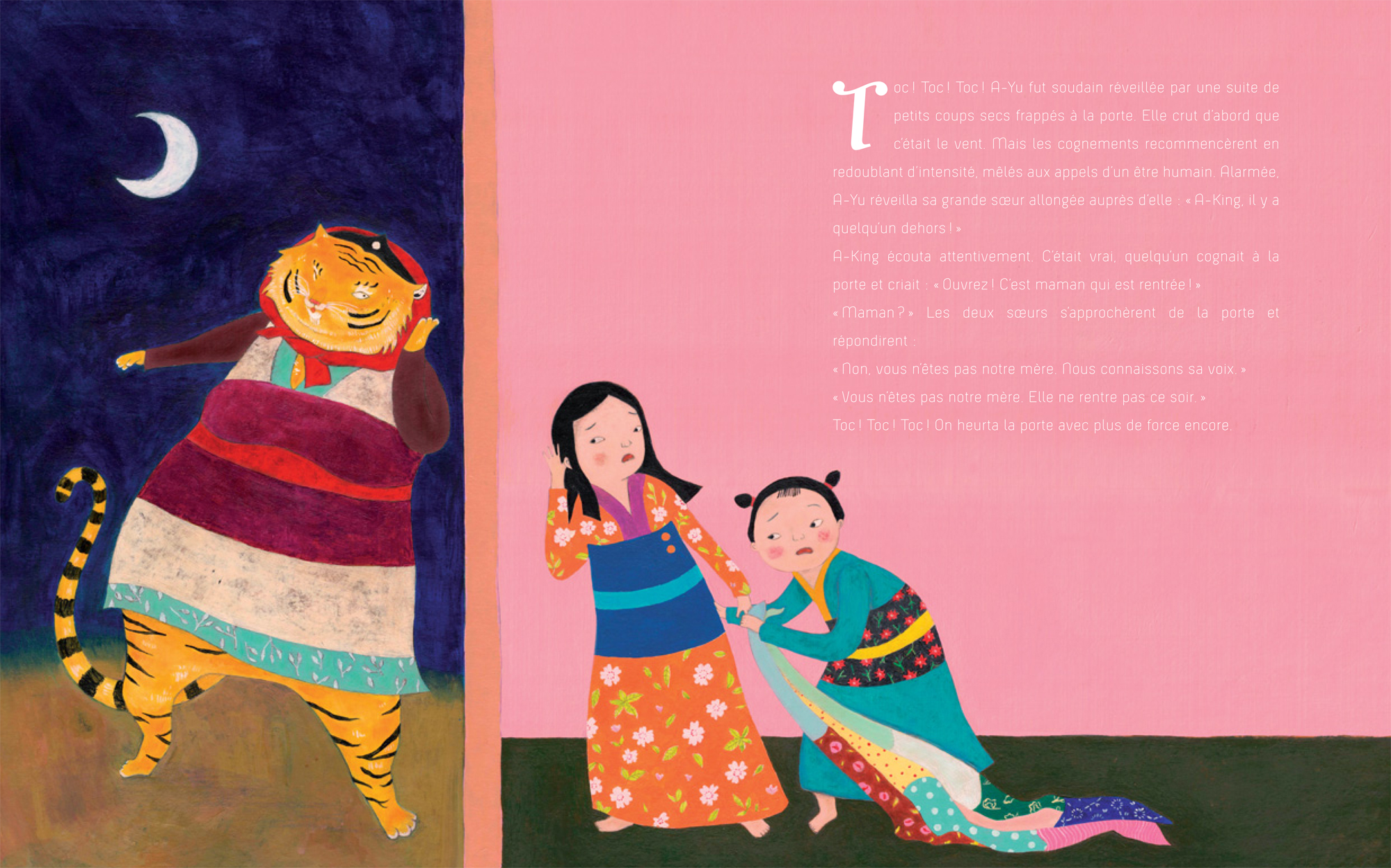 Ayant choisi ce conte, l’éditeur m’a demandé de le remanier un peu avant sa publication. En tant que chercheuse, je n’ai pas le droit de modifier les matériaux que je collecte, mais en tant que conteuse, il y a une certaine souplesse : on ne raconte jamais exactement la même chose. Ici, avec l’éditeur, on se demandait s’il fallait que la soeur ressuscite à la fin, comme dans le conte de Grimm. Nous avons aussi discuté longuement du doigt de la fillette que le tigre tente de faire passer auprès de sa soeur pour une cacahuète – l’éditeur suggérait d’en faire un bouton de pyjama. Mais souvent, ce que les adultes ne trouvent pas bien (l’anthropophagie, la scatologie…) plaît beaucoup aux enfants. Surtout, je voulais conserver l’authenticité du conte taïwanais, qui n’est d’ailleurs pas la variante la plus cruelle (en France, on trouve dans le répertoire de Nannette Lévesque, par exemple, une variante du Petit Chaperon rouge où le loup fait manger à l’enfant la chair fraîche de sa grand-mère – il faut dire que le conte n’était pas au départ destiné aux enfants). Finalement l’éditeur est resté ouvert et m’a fait confiance tout en prenant le risque : il a conservé l’essentiel des éléments.