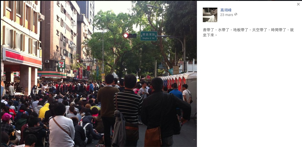 Ils sont nombreux en effet à avoir rejoint le mouvement. On citera en particulier Huang Chong-kai [黃崇凱] (1981-…), auteur entre autres des nouvelles Plus loin que Pluton《比冥王星更遠的地方》et L’Homme brisé《壞掉的人》(https://www.facebook.com/profile.php?id=100000182406760). Dans une longue note, il insiste sur l’apprentissage que permet le « mouvement des tournesols » en matière de maniement des idées, d’analyse de questions complexes et de prise en compte des points de vue divergents. Il souligne aussi que ce mouvement fournit à ses participants une occasion unique de s’intéresser à d’autres questions historiques et sociales, « la possibilité de commencer à comprendre » et d’être « une partie de la réponse ».