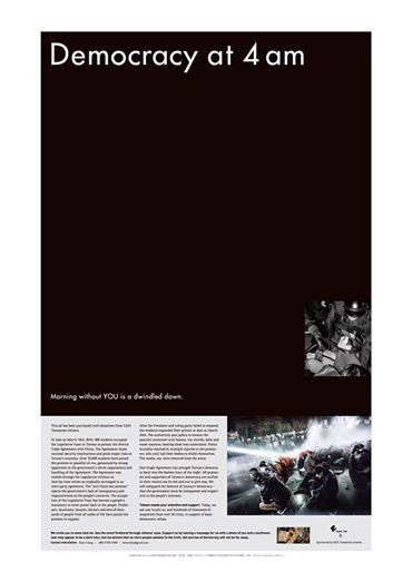 Le premier à répondre à l’appel de Rex How est le graphiste Aaron Nieh [聶永真] (1977-…). Auteur de plusieurs livres et éditeur d’ouvrages de photographies, il soutient le mouvement des tournesols depuis les premières heures. C’est lui qui a conçu la campagne « Democracy at 4am », déclinée sur un site internet (http://4am.tw) et par une série de publicités dans des quotidiens à grand tirage, notamment dans le New York Times, contribuant au retentissement international de la « révolte des tournesols ».