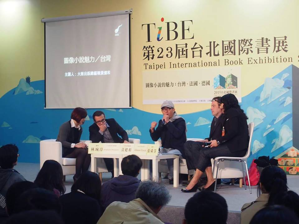 Stéphane Beaujean, Aho Huang et Johann Ulrich le 13 février 2015 au Salon du livre de Taipei lors d’un débat sur le roman graphique.